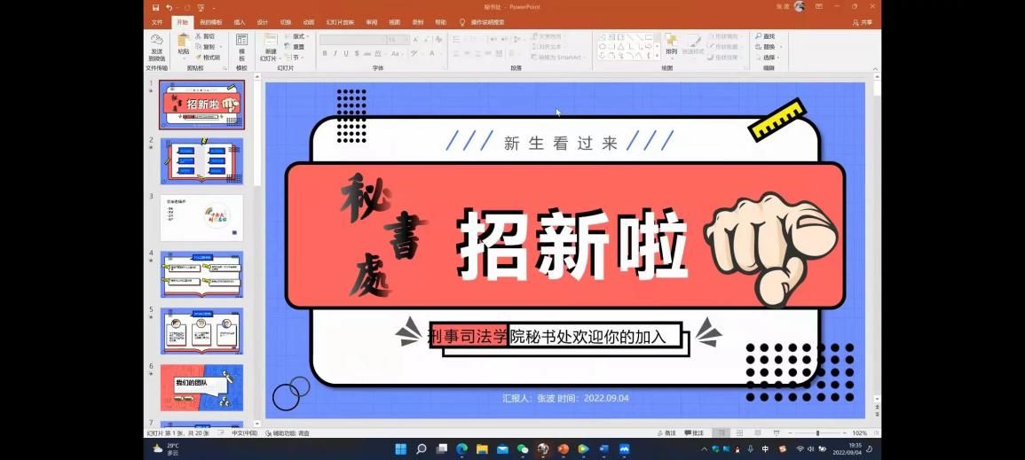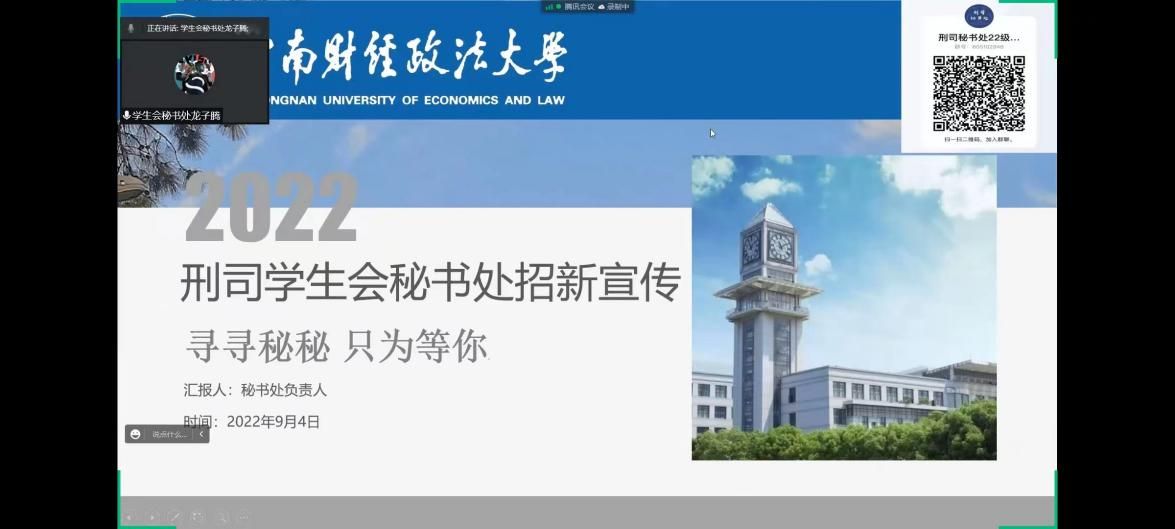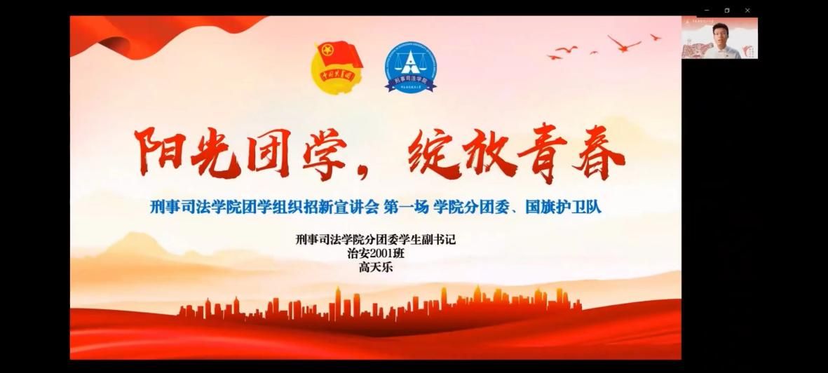 新闻网讯(学生记者 金雯星)风进帆满图新志,砥砺奋进正当时。值此二十大即将召开之际,刑事司法学院分团委于2022年9月3日晚19:00,通过线上会议的形式,面向2022级新生召开了我院团学组织宣讲会,进一步了加深新同学们对学院团学组织的认识和理解,推动我院学生工作的发展。