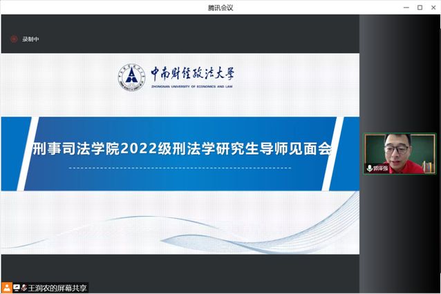 金秋九月,喜逢双节到来,刑事司法学院2022级刑法学研究生导师见面会于9月10日上午通过腾讯会议顺利举行。刑事司法学院刑法学科带头人齐文远教授、杰出校友刘艳红教授、学院党委书记张志刚、副院长董邦俊教授、博导组组长童德华教授等学院刑法学导师出席本次会议。本次会议由副院长郭泽强教授主持召开,2022级全体刑法学研究生与博士生参加。