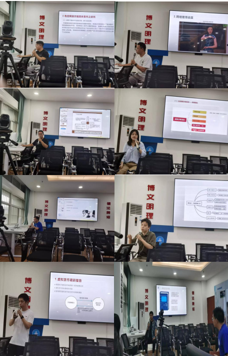 第一个发言的是侦查学博士彭哲。他从监督人员未完全适应新的监督模式、未形成有效的动态监督和捕诉合一下的监督质量不高三个方面进行了详细报告。第二个发言的是侦查学硕士张红彬。他从法学和侦查学的角度分析了养老类诈骗案件。汇报内容为案件的特点,案件处理过程中的焦点问题和诈骗证据认定三个方面。第三个发言的是公安厅实习情报组成员。他们从情报组工作流程、情报研判思路总结、内部资料学习心得、内部讲座学习心得和案件调研报告五个方面详细介绍了情报组的实习经验。第四个发言的是公安厅实习行动组成员。他们分别从跨境网络赌博犯罪一体化打击和大学生涉卡犯罪统计与帮信罪行刑衔接研判两个方面介绍了省内公安打击该类犯罪的基本工作模式。