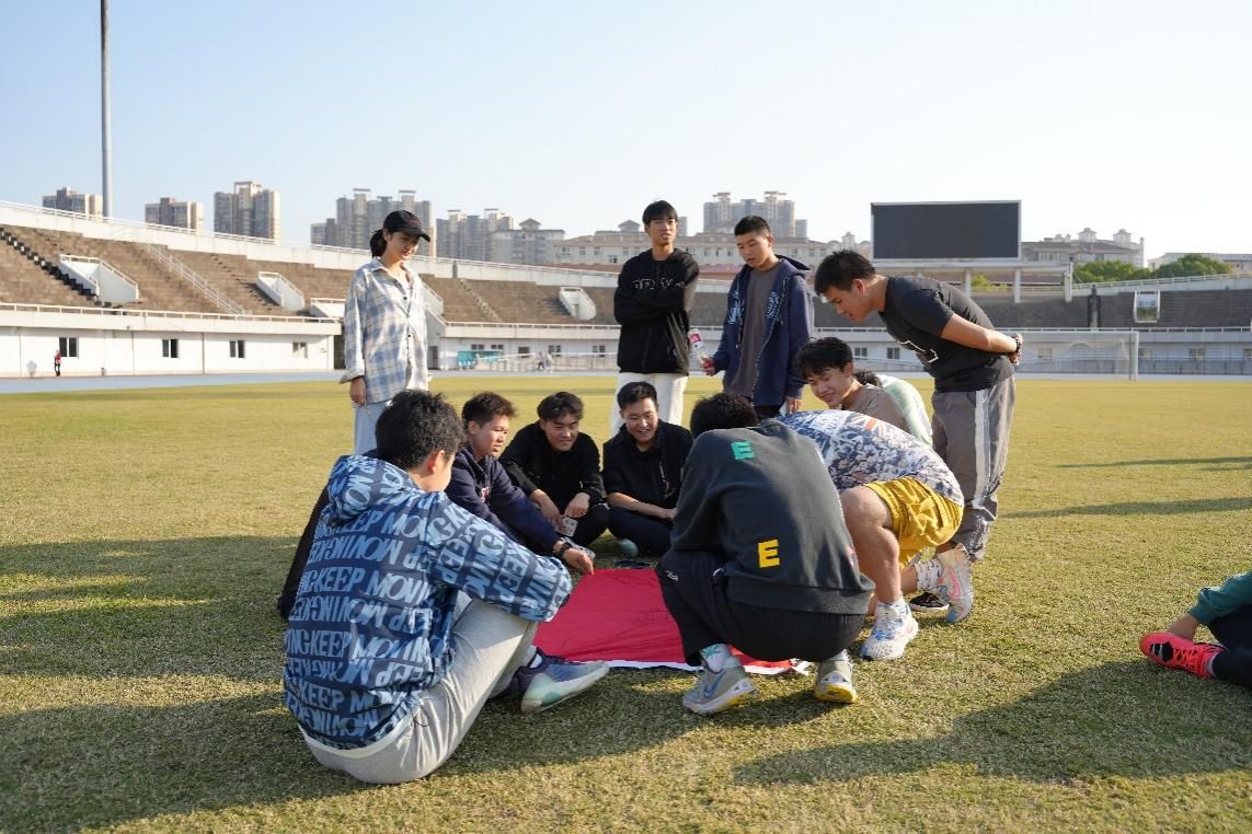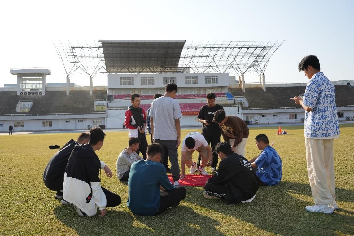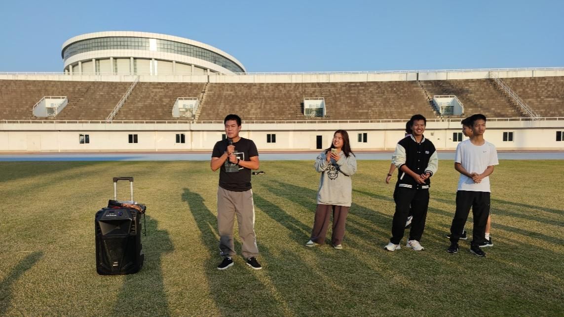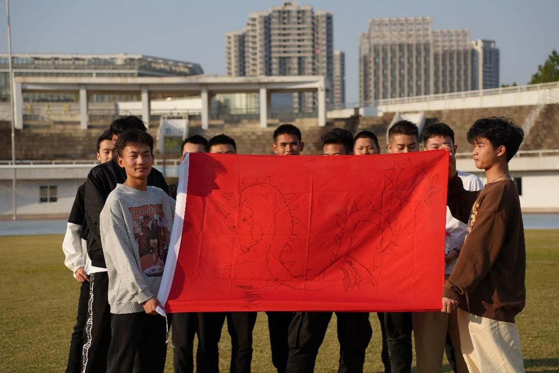 在团建环节中,五支队伍均在规定时间内完成任务。在主持人的介绍下“二龙戏珠队”“熊熊队”等队伍依次上场,进行创意展示。同学们在队旗设计上“各显神通”,中国传统文化、卡通动漫元素“你方唱罢我登场”。在队歌的选取上也各具特色,一时间,运动场上回荡着追忆峥嵘岁月的经典旋律与展现时代风采的流行歌曲。同学们也在此起彼伏的歌声中与时代脉搏同频共振,在历史与现实的交汇点上感受时代对青年的召唤。