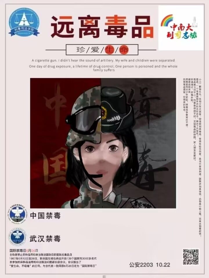 接着,每三个志愿者组成一个小组,在学校各个食堂的显眼位置张贴海报,吸引了不少围观的人,也推广了本次禁毒活动。海报上印画着飒爽的禁毒军警形象,我们希望通过画像来传达“为毒品花的每一分钱,都是打在缉毒警察身上的子弹”的理念,以此引起同学们的共鸣——创造安全的无毒环境,需要全社会共同努力。我们身为新时代的青年更要积极有为,防毒禁毒,从我做起。