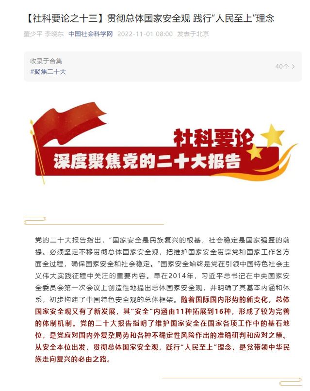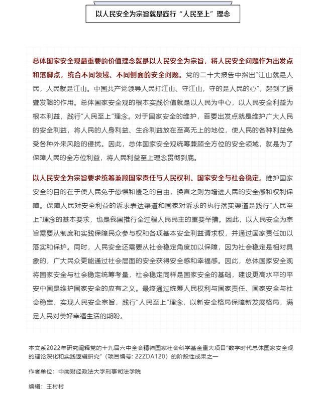 新闻网讯(通讯员 刘宇)中南财经政法大学刑事司法学院博士研究生指导教师董少平教授等《贯彻总体国家安全观践行“人民至上”理念》一文由中国社会科学网于2022年11月1日收录。