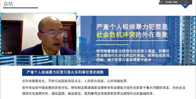 (学生通讯员 易姗姗)2022年11月25日15时30分,湖北省公安厅刑侦总队王海军副总队长应邀主讲“严重极端个人暴力犯罪与类案预防治理路径”。讲座由湖北省法学会犯罪学研究会副会长、中南财经政法大学刑事司法学院副院长、博士生导师董邦俊教授主持;中南财经政法大学刑事司法学院李正新副教授、何正泉老师、徐惠老师、栾兴良老师、张丽霞老师等部分师生线上参与。