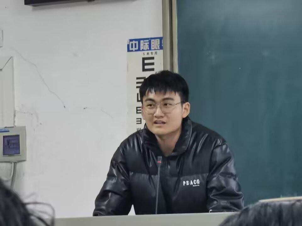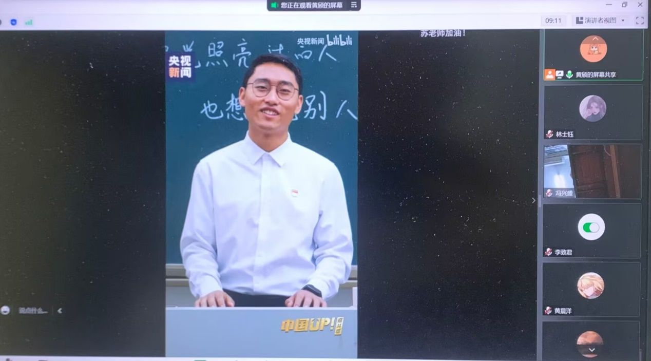 首先,团支书用视频向同学们展示了一位我们身边的“新时代好青年”,同时也是我们的校友——苏正民师兄。通过视频,我们了解到苏正民在本科毕业之际,主动放弃了去大城市就业的机会,义无反顾地投身于家乡大凉山的公益教育事业。“一路上,同学们,老师们都那么关心我、帮助我,现在我也想通过自己的知识和力量去帮助像我一样的孩子们摆脱贫困、无知和自卑?!闭馐撬照袷π值姆胃?,同时也展现出了新时代青年的高尚品质。借此机会,团支书号召同学们学习苏正民师兄无私奉献和坚忍不拔的高尚品格。