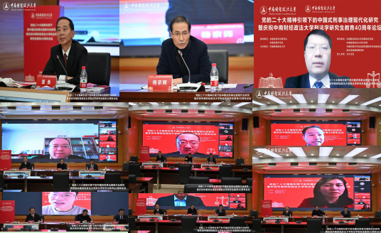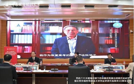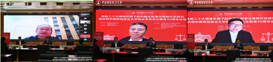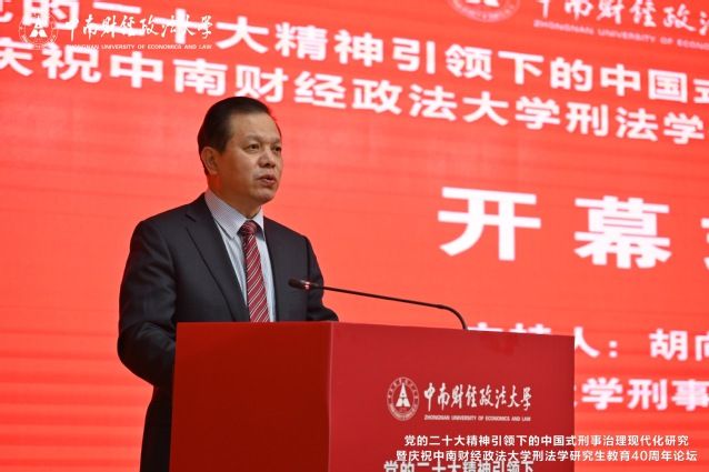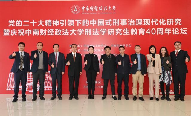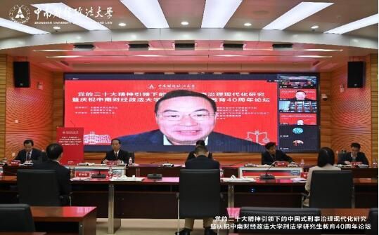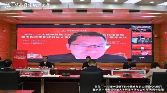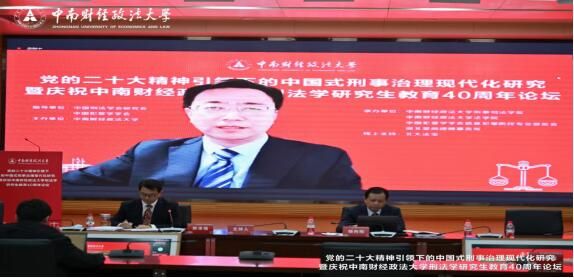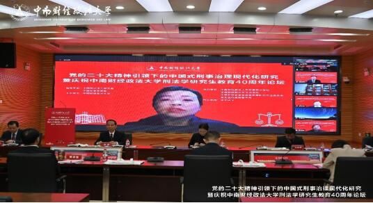 新闻网讯(通讯员韦春发)为深入学习贯彻党的二十大精神,全面提升新时代刑事治理水平,传承中南大刑法学科为党育人、为国育才的初心使命,11月27日,在中国刑法学研究会和中国犯罪学学会共同指导下,由我院主办的“党的二十大精神引领下的中国式刑事治理现代化研究暨庆祝中南财经政法大学刑法学研究生教育40周年论坛”,以“线上+线下”的方式在南湖校区举行。校党委书记栾永玉教授,校党委常委、副校长闫平教授,校党委常委、副校长姚莉教授,校法学学科带头人吴汉东教授,法治发展与司法改革中心主任徐汉明教授等出席论坛。学校领导、校友、各兄弟院校专家学者共计71人在论坛发言,论坛直播吸引了3万余人在线收看。