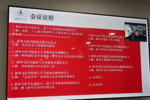 接着,刑事司法学院博士生导师、副院长董邦俊教授对博士研究生培养管理办法进行介绍。董邦俊教授指出要坚持导师负责制和导师组集体指导相结合,在思政方面坚持五育并举,在学术培养方面做到因材施教,并对博士研究生的学制变化、英语课程免修条件等相关制度规定进行了详细介绍。