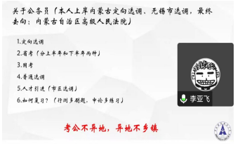 首先由陈乾根据自身的就业经验分享就业方向的选择问题以及如何准备公务员考试,他建议同学们提前去律所、检察院、法院等地方实习,体验工作环境,提前做好准备,根据就业目标确定自己的研究生规划;在公考准备方面,他从选调生备考原则、公务员考试复习的时间规划、岗位选择等方面进行了分享,并推荐了学习平台。