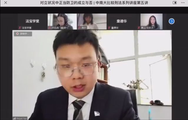 第三位与谈人是姚培培老师,姚培培老师首先对诸位老师表达了感谢,随后也提出了自己的见解。姚老师首先介绍了防卫挑拨问题的中国通说与实务解决方案,还指出目前对其处理存在的问题。就高山老师的讲座内容,姚老师准确总结了其创新之处,还进一步介绍了高山老师的观点与其关于正当防卫正当化根据的理解的一致性。最后姚老师还就有关防卫挑拨的一些实际共犯案件中如何认定各行为人责任的问题向高山老师进行了询问。