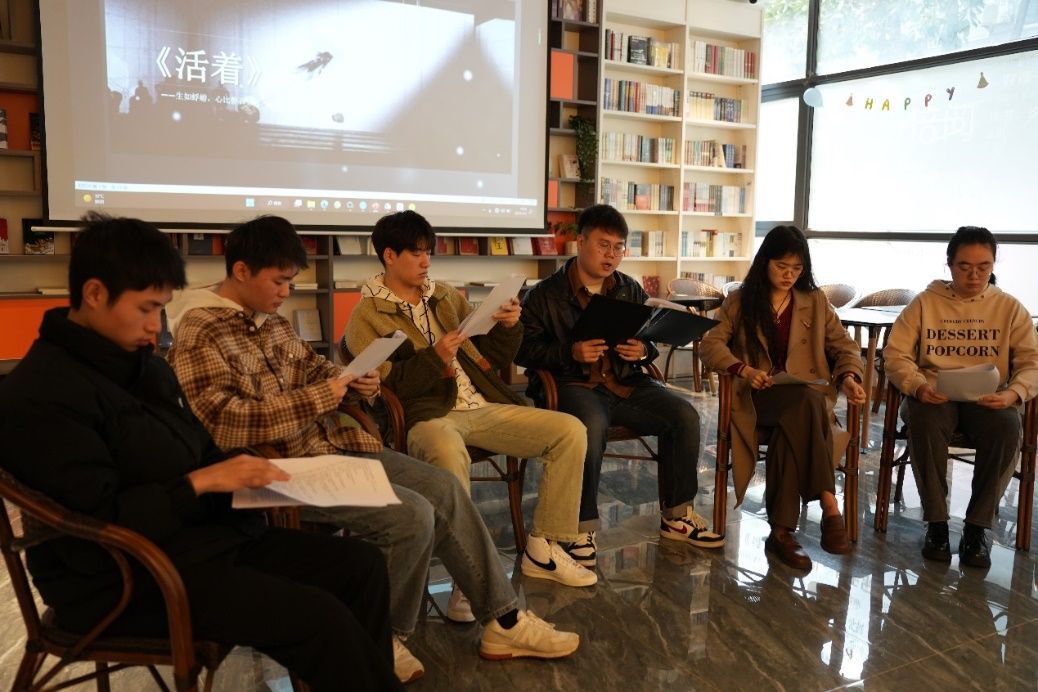 此次活动还邀请到了中南财经政法大学首义话剧社的成员们,话剧社成员们分饰剧中的主要人物福贵、家珍、凤霞等,带来一场别开生面的剧本围读。演员们以富有张力的表演、过硬的台词功底沉浸式地再现了余华老师书中所描写的绝望与挣扎,深深感染着在场所有观众。剧本围读结束后,同学们爆发出雷鸣般的掌声。