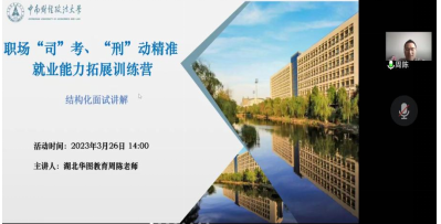 新闻网讯(学生记者 葛庆瑜)3月26日下午2时,由刑事司法学院研究生会、法硕中心研究生会联合华图教育举办的“研职有道之闪耀职场——就业能力拓展训练营”活动以线上会议形式顺利举行。本次活动围绕“更快更全更高”的主旨,以“本研互动,合作共赢”的方式,让同学们提升公务员面试应试能力,促进毕业生及时就业、全面就业、高质量就业。