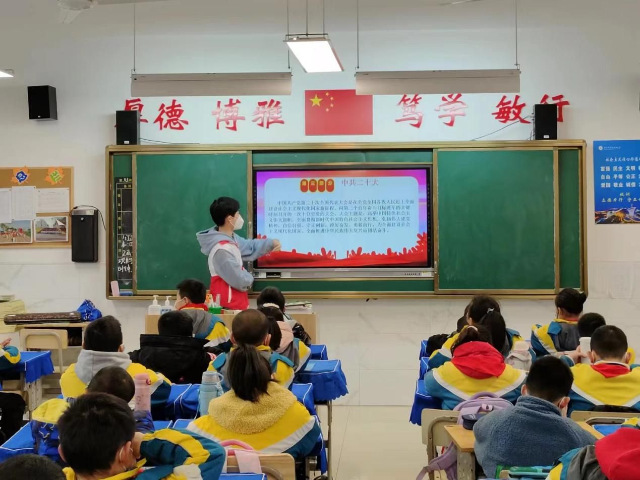 接下来是课堂第三部分“学习党的二十大精神”。志愿者们结合实例向同学们介绍了党的二十大召开的重大意义与重要成果,号召同学们学习贯彻党的二十大精神,积极投身于社会主义现代化建设之中。