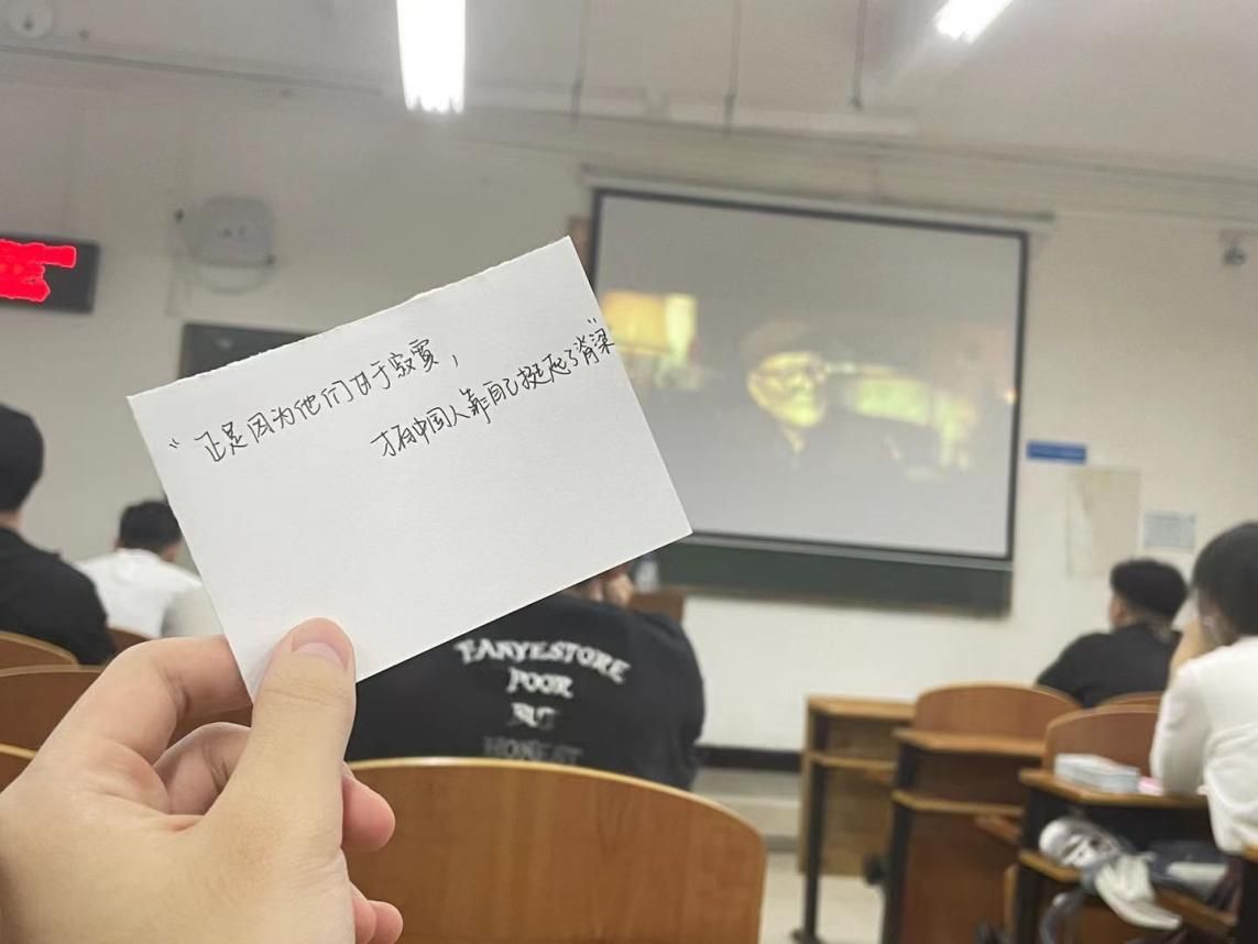 下一环节,由刘思霁带领同学们一同观看微电影《一生有信》,帮助大家深入了解张富清、王伟、林巧稚等多位先辈们平凡而又伟大的事迹,体会坚守在岗位上的平凡人所带来的感动,亲笔书写下自己的感悟,鼓励同学们见贤思齐,致敬英雄,以实际行动奏响时代主旋律,献礼青春。
