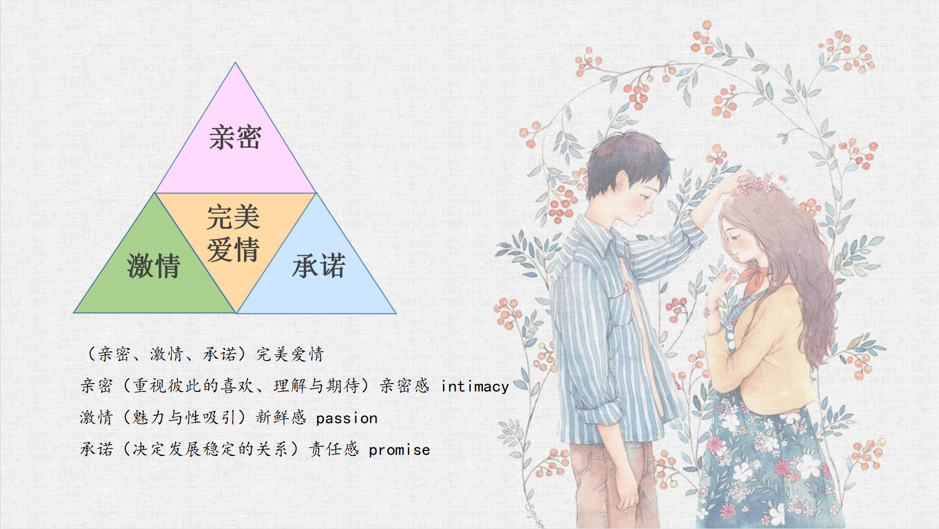 最后,心理委员向同学们讲解了斯坦伯格爱情三角形理论及我们设计的各项活动与之产生的对应关系,也揭开了此次“三角”恋的真正面纱。最后也向参与活动的同学送上了真挚的祝福:希望在未来能够主动拥抱三角法则,邂逅自己的完美爱情。参与活动的同学们纷纷表示:通过体验的形式引出班会的理论实在是太有意思了!“三角”恋的主题也在最后给了恍然大悟的效果。