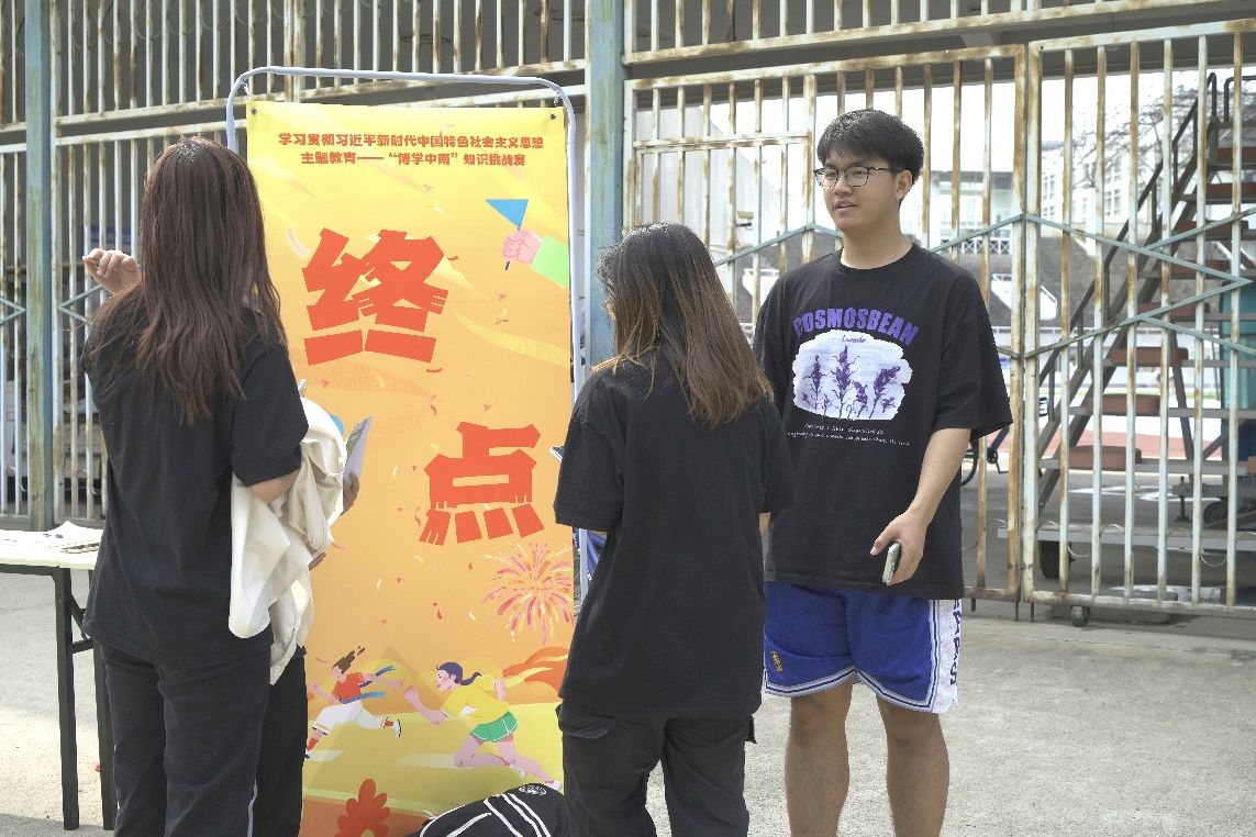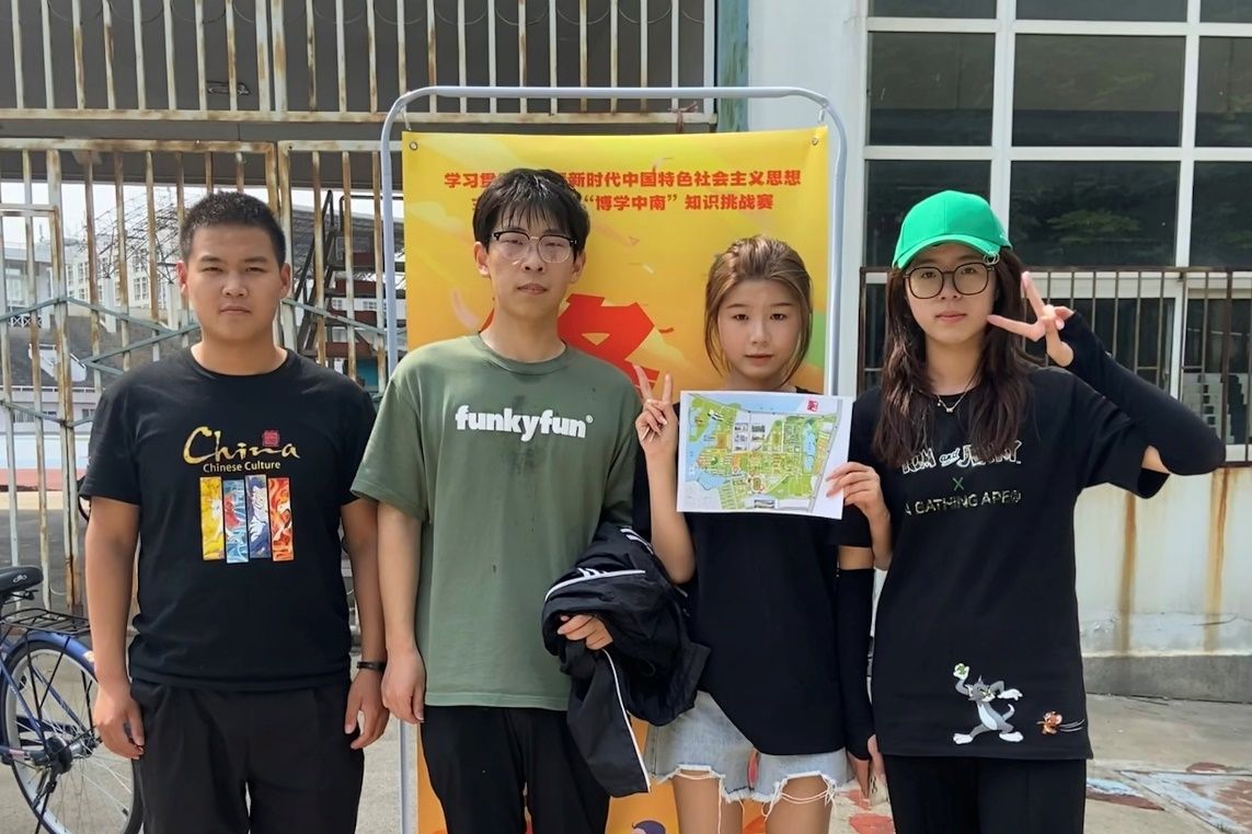 在认证点一,队员们轮流作答不同题目,通过回答问题的方式获取道具弓箭,最后在射箭环节将易拉罐全部击倒;认证点二,队员们抽取到文学名著类题目,两位队员通过颠羽毛球的方式争取回答时间,另一位队友描述出题方提供的相关词语,最后一位队员迅速猜出题目中的相关内容,拿下又一个认证点;认证点三,队员们陆续进行平衡传球,并在接到球的同时说出规定词语,最后一位队员用流畅的语句囊括出上述词语;认证点四,队员们陆续抽签回答出与校史、常识、中国历史有关的题目;认证点五,四名队员各完成20次呼啦圈后,依次回答出含有辛亥革命的诗句。