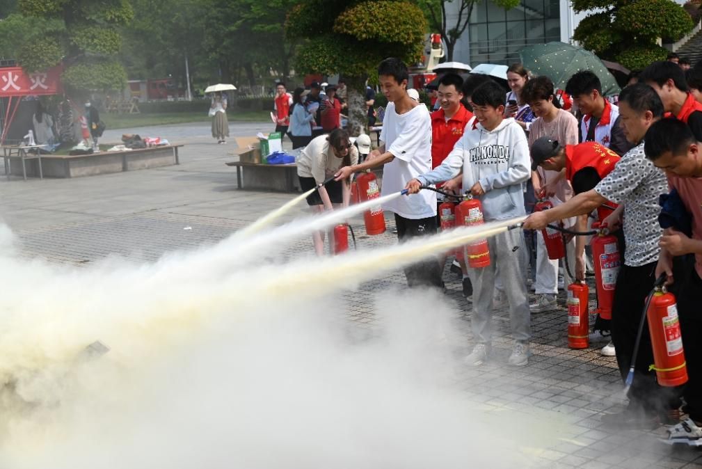 演练第三阶段,彭定勇详细讲解了干粉灭火器五步使用法:一提、二看(观察灭火器压力表指针是否在绿色区域)、三?。ㄉ舷乱《可?,使瓶内干粉松动)、四拔(拔掉保险销)、五压(按下压把),并在现场实际操作灭火,同时强调注意事项:一要站在上风口,二要对准火焰根部灭火。现场观摩人员听后纷纷行动,拿起学校提前准备的100余个灭火器进行实操。