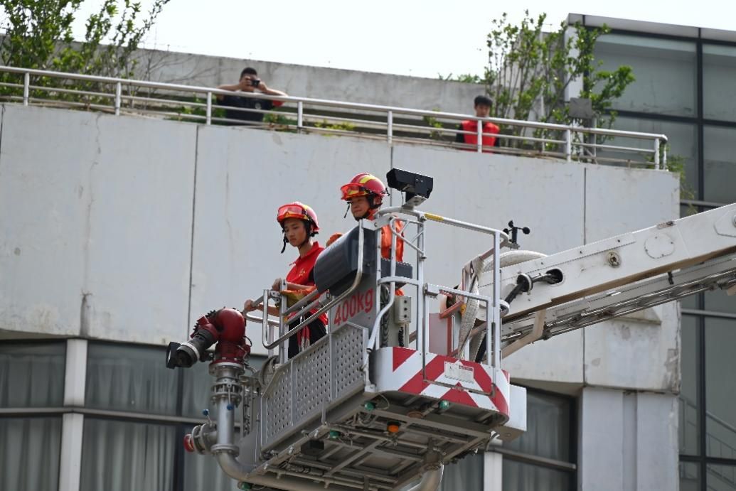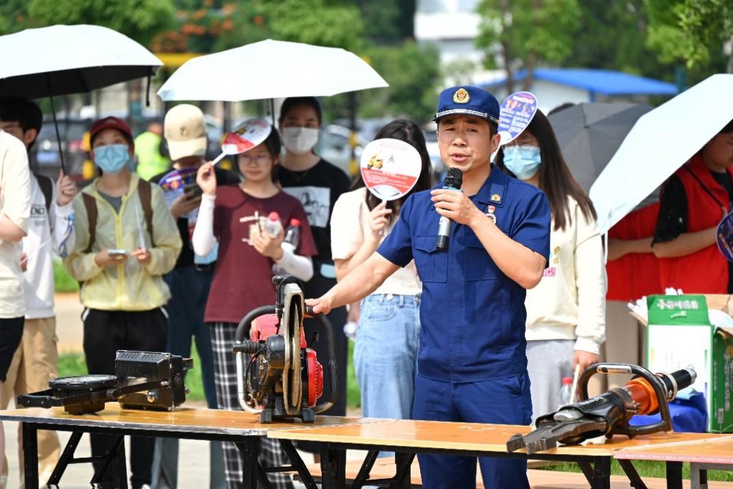 演练的第二个环节,东湖新技术开发区消防救援大队的工作人员对不同消防器械和器具进行了详细的介绍,为在场师生讲解并展示了两种不同类型消防车的功能和用途,在本次消防演练中,志愿者同学扮演被营救人员亲身体验了云梯,理论与实践相结合的方式,更好地帮助了广大师生增进对消防知识的认识和了解。