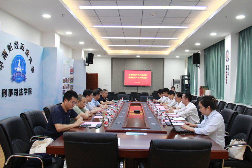 首先,刑事司法学院院长胡向阳教授致欢迎辞。他向陈静院长一行的来访表达了热烈欢迎,对沙洋县人民法院的重视与信任表示十分感谢,并向他们详细介绍了我院的优质教研平台和雄厚师资力量,提出这与沙洋县人民法院的合作期待高度契合。他指出,本次会议致力于优化和完善已有的合作基础,通过合作目标的厘定、合作内容的确定、合作计划的拟定等流程,扎实推进双方共建合作的制度化和实质化。他认为,此次合作有利于充分发挥双方优势,一方面,沙洋县人民法院在业务一线有许多宝贵经验和珍贵资料,有利于助推学院的人才培养和学科建设;另一方面,学院的师资力量和教研平台也可以助力于法院实践成果的产出。他表示期待双方未来继续深入合作,共同打造携手共建、合作共赢的典范。