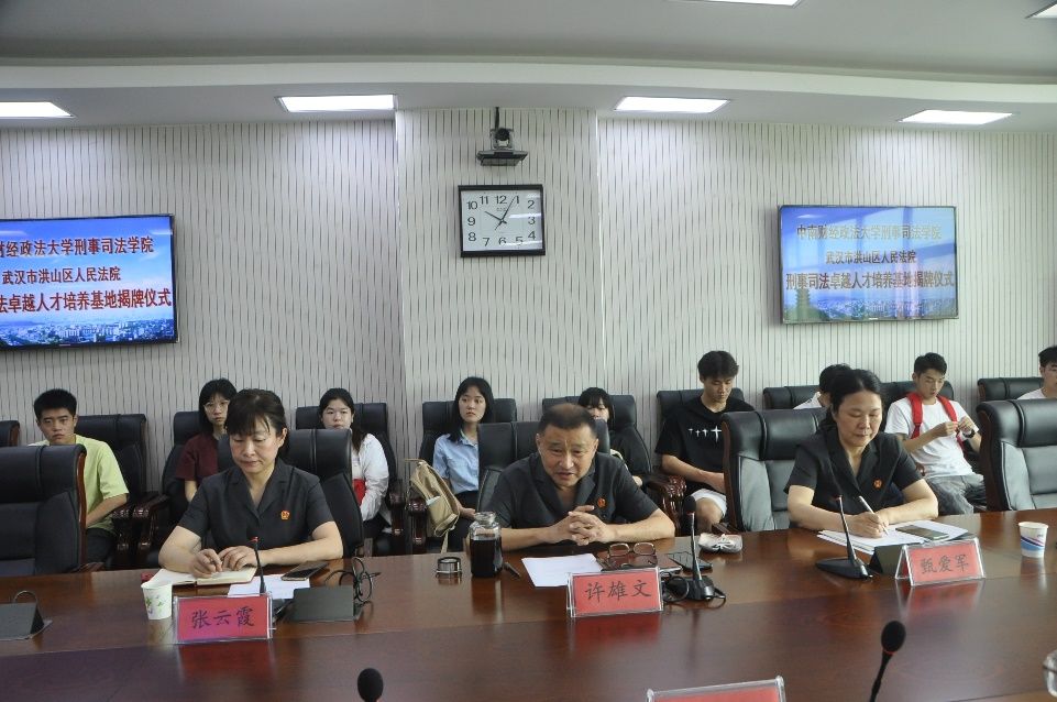 新闻网讯(学生通讯员 许博)暑意渐浓,风华正茂。2023年6月30日上午九点半, 武汉市洪山区人民法院实习点实习动员会暨“刑事司法学院卓越人才培养基地”授牌仪式在武汉市洪山区人民法院顺利举行。洪山区人民法院副院长许雄文、政治部主任甄爱军、办公室主任张云霞、刑事司法学院领导张志刚书记、副院长董邦俊教授以及21级10名本科生参加了此次会议。