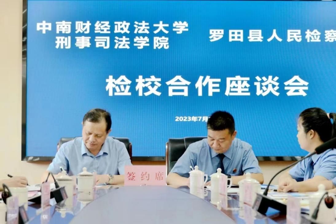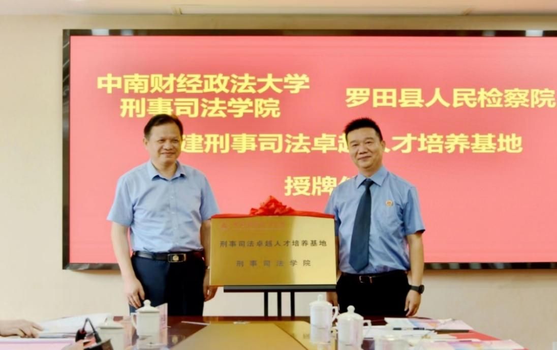 为深入贯彻落实习近平法治思想,加强高校与检察院有效联动,促进人才培养与实践需求深度融合,推动科研与教学高质量发展,7月19日上午,中南财经政法大学刑事司法学院院长胡向阳,警事科学系教师何正泉、黎晓露、吴风一行赴罗田县检察院看望实习生,举行中南财经政法大学与罗田县检察院共建刑事司法卓越人才培养基地签约仪式。中南财经政法大学刑事司法学院院长胡向阳,罗田县检察院党组书记、检察长汪辉为检校共建签署协议,共同为“刑事司法卓越人才培养基地”揭牌。检察院党组副书记、副检察长黄萍参加活动,检察院党组成员、政治部主任罗燕主持仪式。