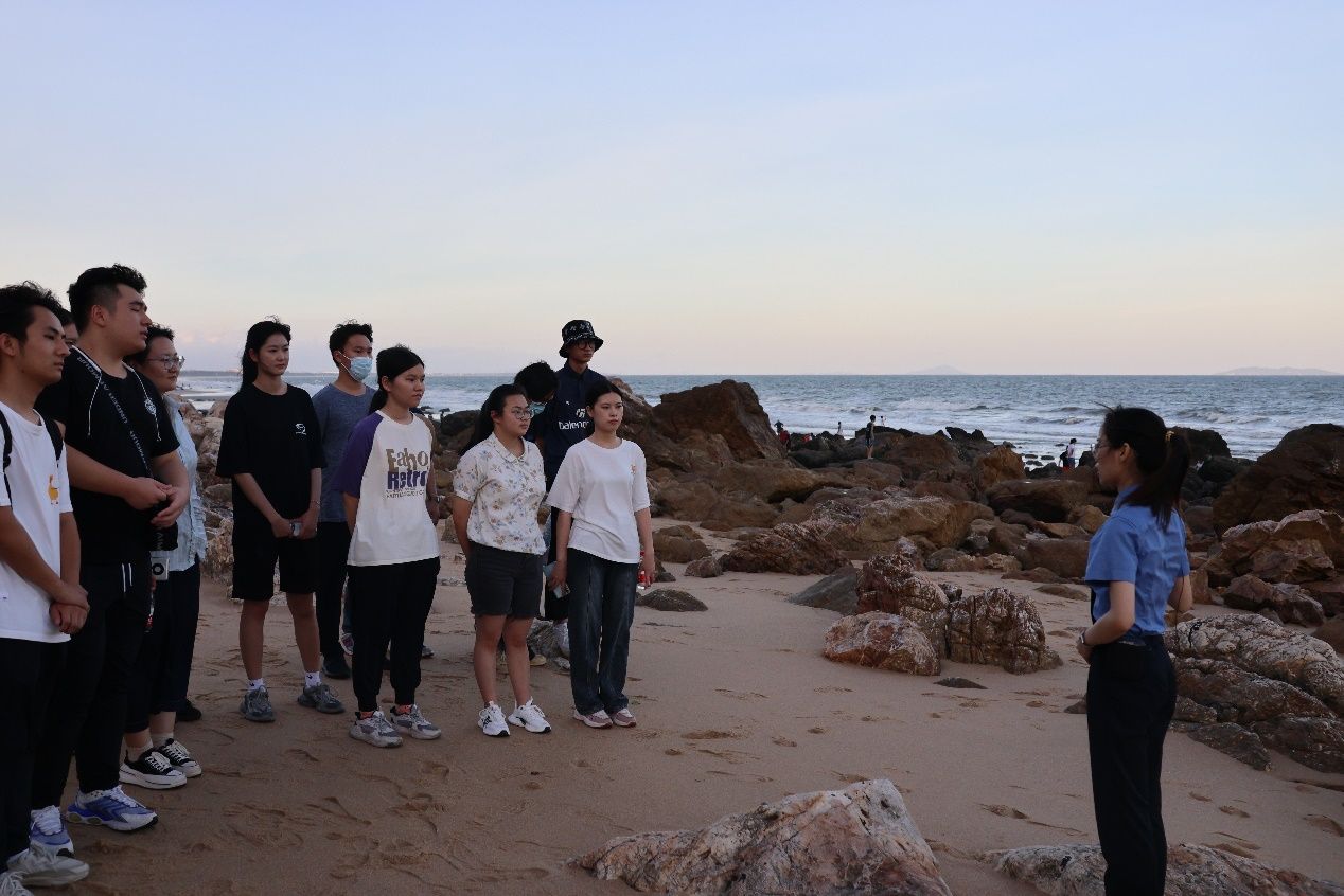 座谈会后,研学团队前往茂名市“百墟千村振兴计划”重要示范平台——晏境社区疍家墟。检察官带领同学们来到童子湾海滩,通过实地考察、案例讲解、工作实务分享等方式,深入了解公益诉讼检察业务。检察官从童子湾优美的生态环境讲起,介绍了海洋生态环境保护、晏境社区乡村振兴工作和公益诉讼基本情况等,展现了电白区人民检察院以及茂名市公益诉讼工作实践和取得的成果。在实地研学过程中,同学们的问题也得到了检察官详细耐心的解答。