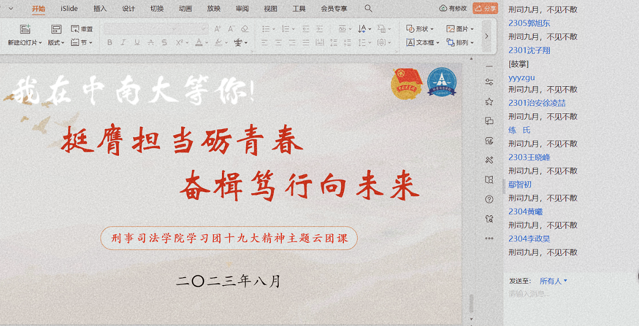 至此,“挺膺担当砺青春,奋楫笃行向未来”——刑事司法学院学习团十九大精神主题云团课圆满结束,同学们纷纷在聊天框打出“刑司九月,不见不散”的字样。风好正是扬帆时,奋楫逐浪向未来,祝愿2023级新同学以梦为马,不负韶华,用这美好的四年时光去实现那些如阳光般耀眼的梦想!