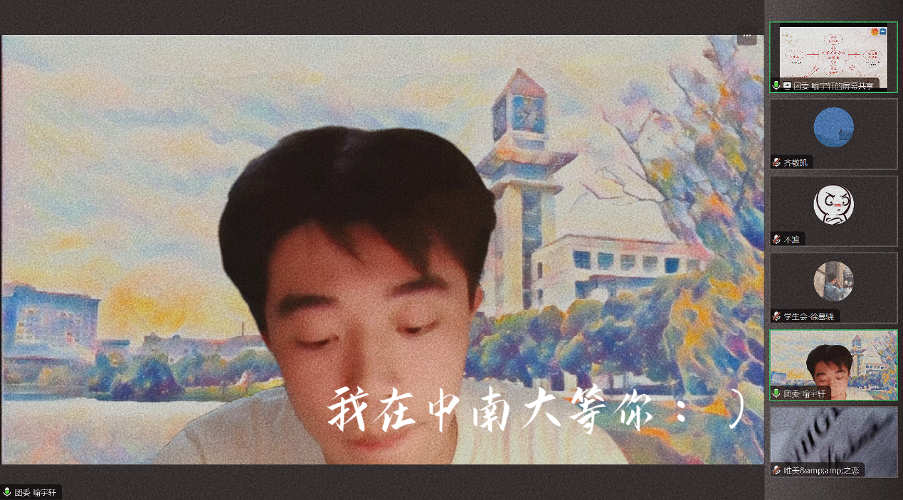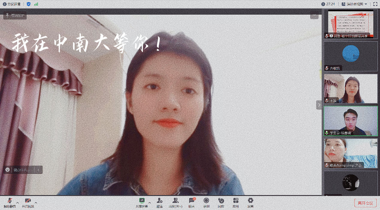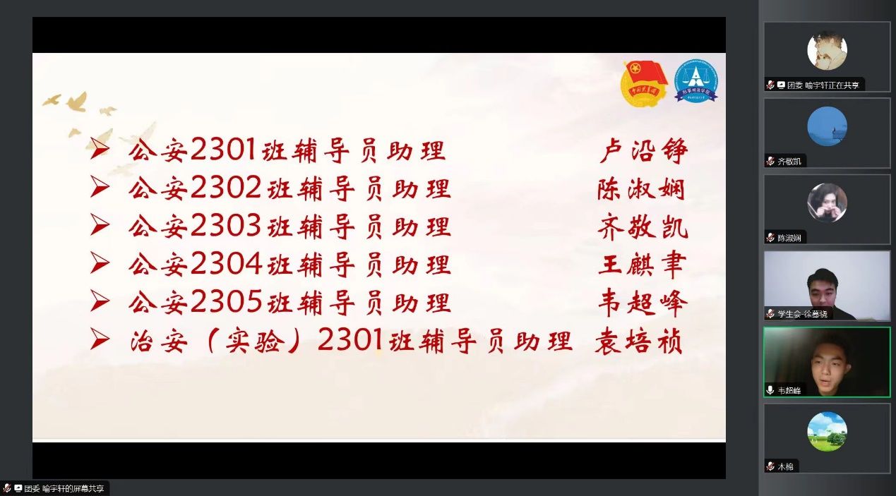 进入2023级新生辅导员助理“云见面”环节,来自2021级的卢沿铮、陈淑娴、齐敬凯、王麒聿、韦超峰、袁培祯六位同学分别进行了自我介绍,向即将开启大学征程的2023级新生表达了祝福和希望。刑事司法学院2023级本科生辅导员黄文菊线上寄语新同学:欢迎亲爱的同学们来到中南财经政法大学!在这里,你们可以和志同道合的小伙伴们一起追逐梦想!四年时光,我将尽我所能,陪伴你们一路披荆斩棘、乘风破浪,希望你们追随信仰之光、扛起历史之责、不负时代之望,成为奋发进取、敢为人先的中南大青年!