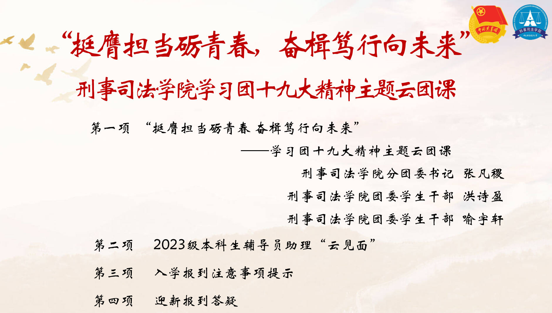 新闻网讯(学生记者 潘煜东)相约南湖畔,共赴新征程。为深入学习贯彻习近平新时代中国特色社会主义思想,立足实际抓好团十九大精神学习宣传贯彻工作,做好2023级新生入学准备工作,增进新生和家长对学校、学院的了解,8月20日19点,刑事司法学院分团委召开“挺膺担当砺青春,奋楫笃行向未来”——学习团十九大精神主题云团课,会议采用线上直播形式进行,刑事司法学院2023级全体本科生及家长近500人参与此次团课,团课由刑事司法学院学生会主席团成员徐蓦骁同学主持。
