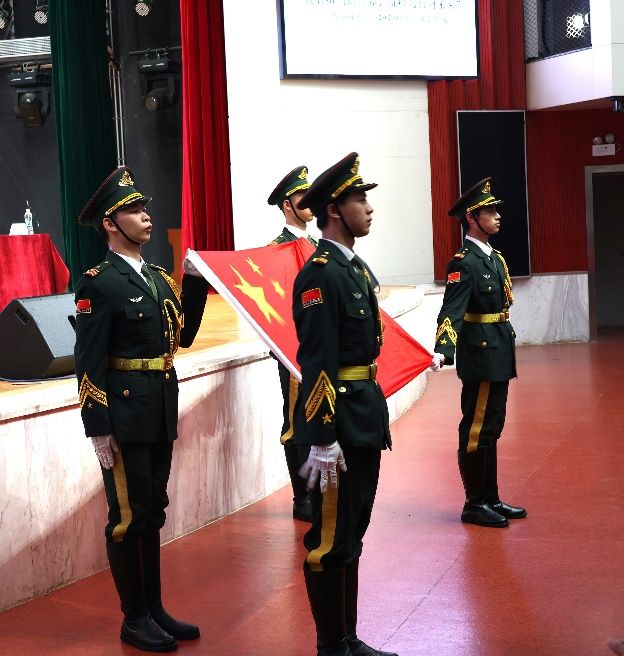 典礼伊始,国旗护卫队踏着铿锵有力的步伐护卫国企入场,全体师生起立并奏唱国歌。