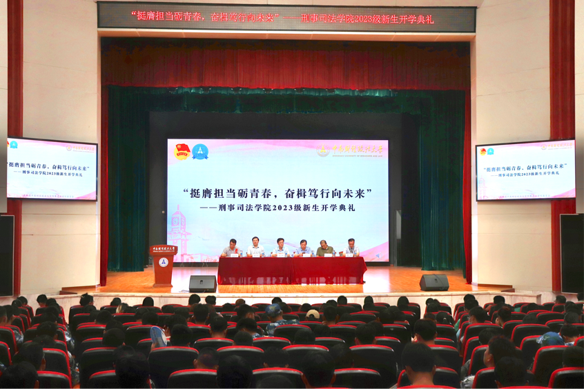 新闻网讯(学生通讯员 刘令同卉 摄影 杨雁书)云天收夏色,木叶动秋声。9月5日中午,刑事司法学院2023级新生开学典礼在南湖校区艺体音乐厅成功举办。典礼以“挺膺担当砺青春,奋楫笃行向未来”为主题,由刑事司法学院党委书记张志刚主持,院长胡向阳、副院长董邦俊、院党委副书记万里雪、副院长郭泽强,党委委员周凌,学院党政办、学办、研办全体老师和专任教师代表出席典礼,全体2023级本科生、研究生共计400余人参加典礼。