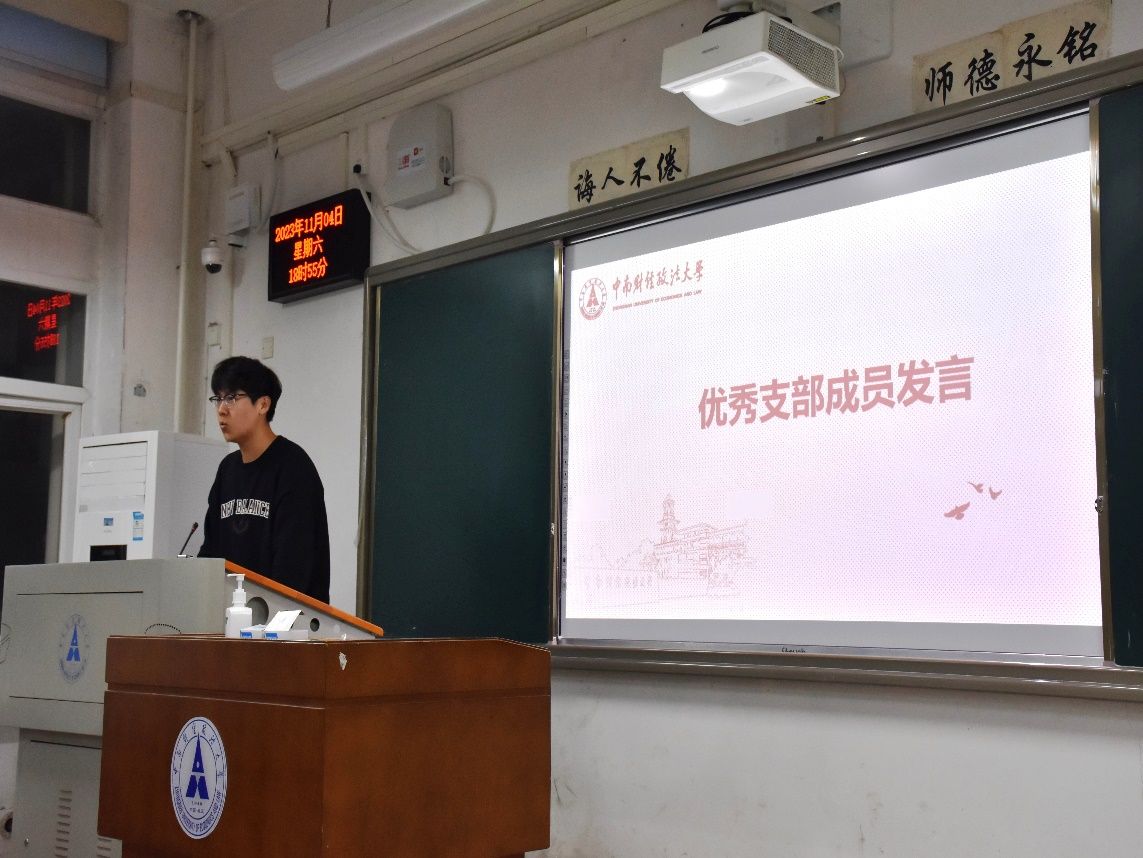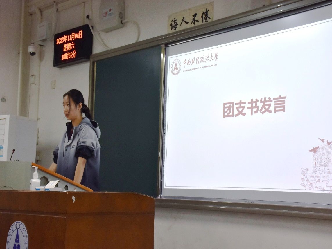 接下来,团支书上台发言,深入总结了前一阶段团支部所取得的成就。她总结了过去的时光,展望了支部未来的发展方向,并向大家提出了她对于奋斗青春的理解。最后,她呼吁每位同学都要有更大的勇气、更高的追求,努力成长,为实现中国梦贡献自己的力量。