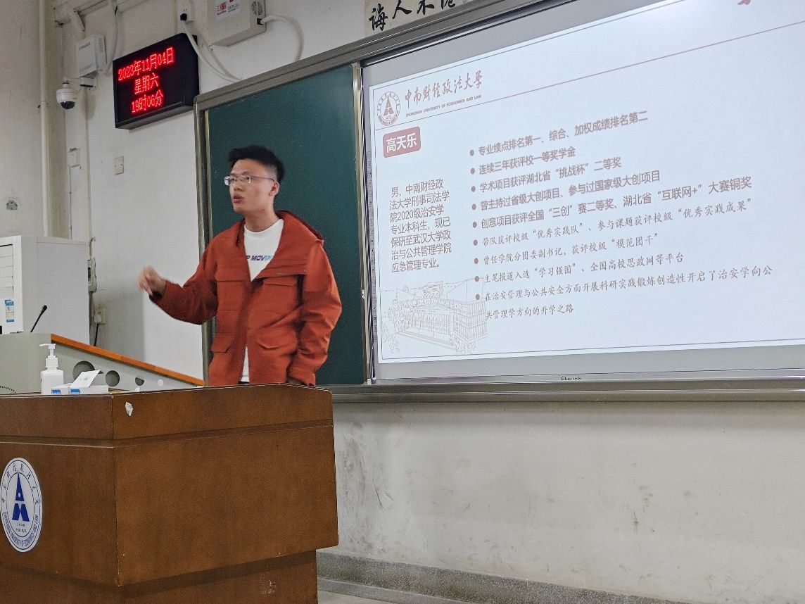 随后,事先邀请的嘉宾,20级优秀推免生高天乐同学上台,与大家畅谈大学生活和学习。他用亲身经历和深入浅出的语言,为同学们传授了宝贵的学习和生活经验,指导我们今天该如何奋斗。现场掌声雷动,每个人都沉浸在他的话语之中,收获颇丰。