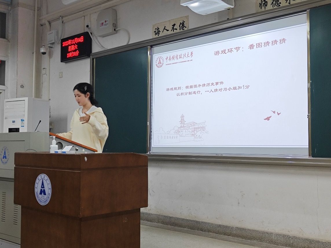 为了活跃气氛,活动期间还进行了“看图猜历史”小游戏。参与人员分为AB两组,采用积分制度,积分较少的小组将接受“惩罚”。同学们积极参与,举手抢答。整个游戏过程充满欢声笑语,大家兴高采烈、投入其中,展现出青春活力以及勇往直前的精神风貌。