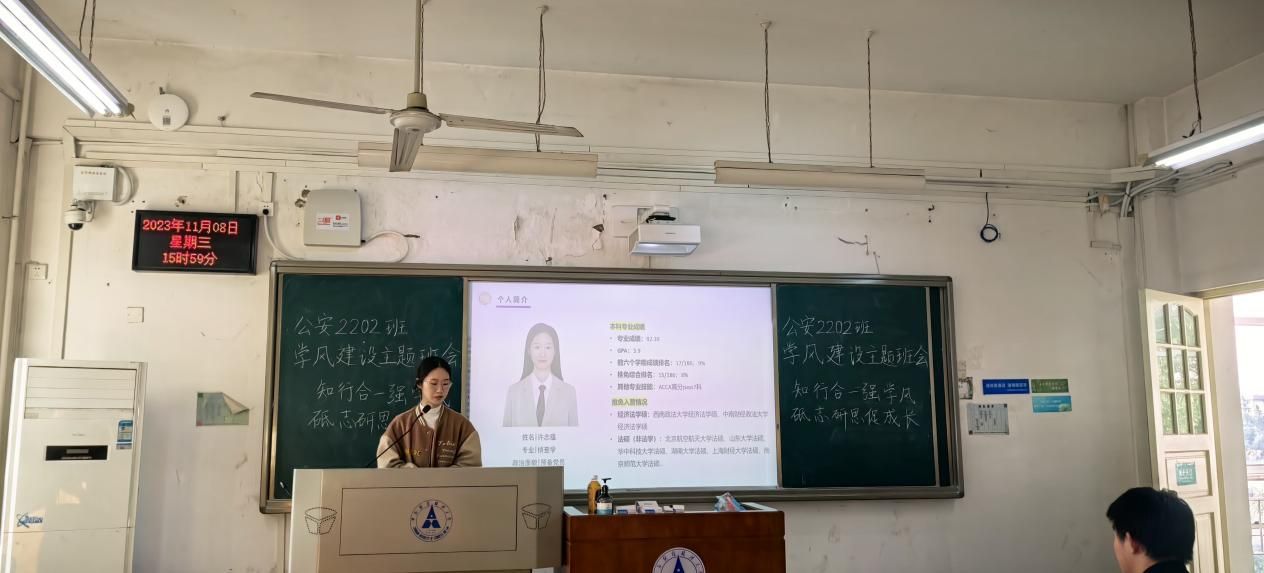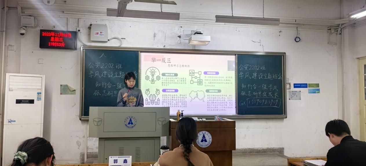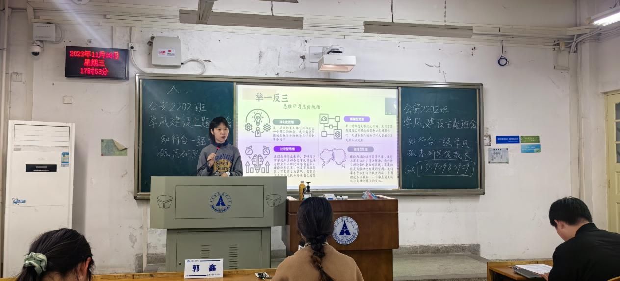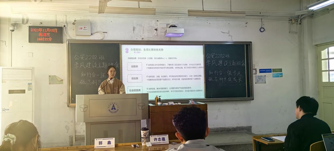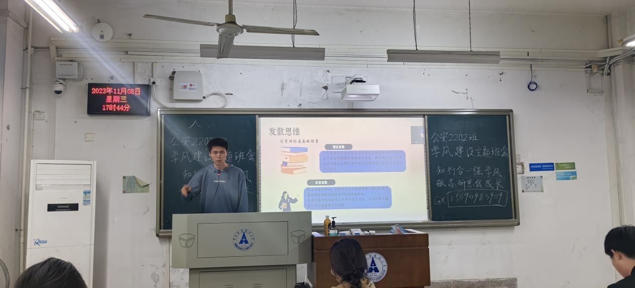 新闻网讯(通讯员 唐基琨)为了培养同学们自我管理、自我规划意识,增强学术实践、学科竞赛能力,推动班集体整体学风建设,展现我院学子独特风采,2023年11月8日下午,公安2202团支部开展了一次精彩而有意义的学风建设主题班会。