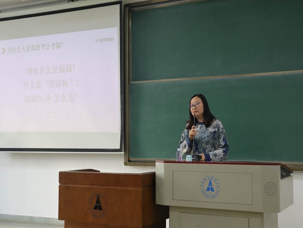 第二位分享的是优仕德教育的王亚老师,她的主题是“2024刑事司法学院公务员考试报考与备考指导”。王老师以同学们的困惑作为切入口,开门见山地向大家介绍了应届生的五次上岸机会,即“国考、省考、选调生、事业编、三支一扶”。紧接着,她提出从确定目标,学业规划,提前备考三个方面把握这五次机会的建议,也详细地分享了考公备考规划。最后,王老师结合专业、区域及岗位的选择、考试内容结构等方面展开了报考答疑。