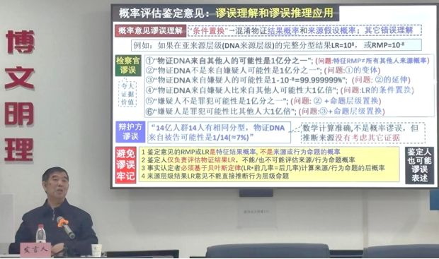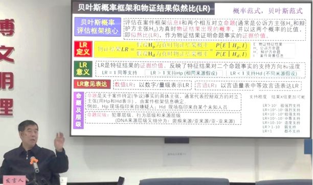 第三部分以理解物证结果解释概念的基础上,更是细致入微的讲授了DNA结果LR意见推理作用,有利于事实认定者得到正确的推理结论,他以DNA证据为例,通过贝叶斯定律计算DNA来源命题的后概率,体现了DNA特征LR的优势与局限,并谈及到概率评估鉴定意见中的谬误理解和谬误推理应用。
