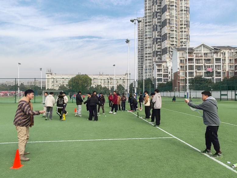 高难挑战,眼疾手快显神通。所有同学站成三列,一名同学持羽毛球拍击球,其余同学用筷子夹羽毛球。游戏难度颇高,每次有人成功,队伍中都会爆发出阵阵欢呼。