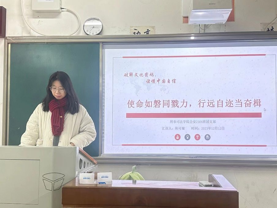 新闻网讯(通讯员 陈可璇)11月24日,世界中国学大会·上海论坛在上海国际会议中心举行,习近平总书记向本次论坛致贺信。为深入理解习近平总书记在贺信中提到的中国学,体会中国文化的深厚底蕴,了解习近平总书记在贺信中提到的“兼收并蓄,开放包容”的精神,深化对中国文化的理解与认同,提高团员青年的文化自信,12月12日,刑事司法学院公安2304班团支部开展主题为“使命如磐同戮力,行远自迩当奋楫“的理论学习团日活动,取得圆满成功。