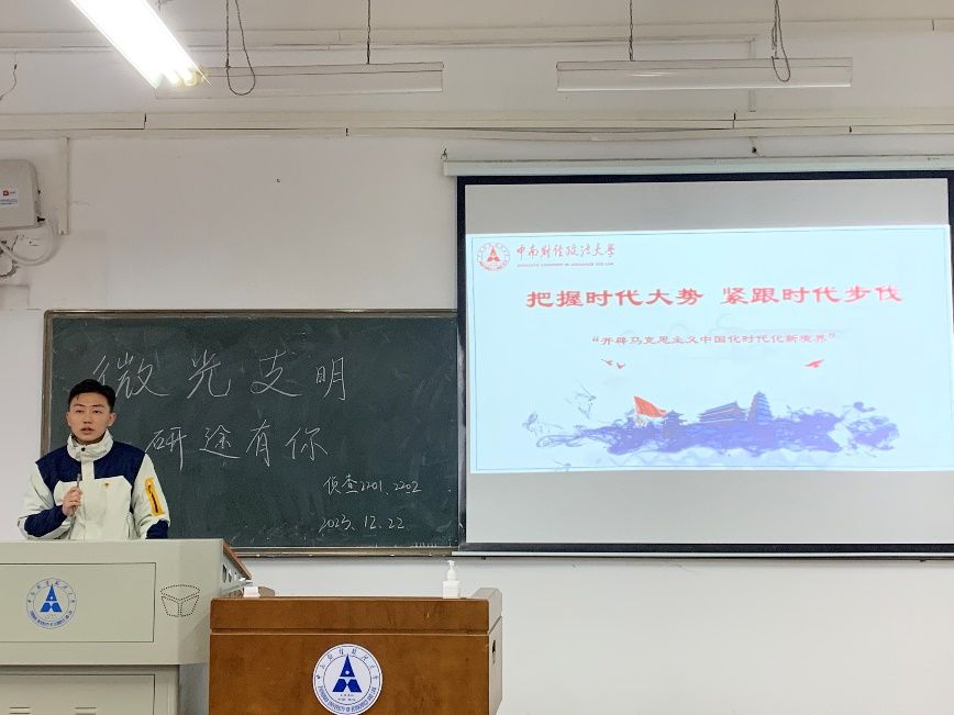 随后,胡杰同学讲授了“把握时代大势,紧跟时代步伐”这一主题内容。胡杰从三个方面展开:在理论解读层面,我们要深刻把握新时代,引领新时代;在实践探索层面,我们需丰富理论内涵,为全面推进中华民族伟大复兴提供行动指南;在构建人类命运共同体层面,我国同世界人民一起携手构建更加美好的世界,将全球各国的命运紧紧联系在一起。