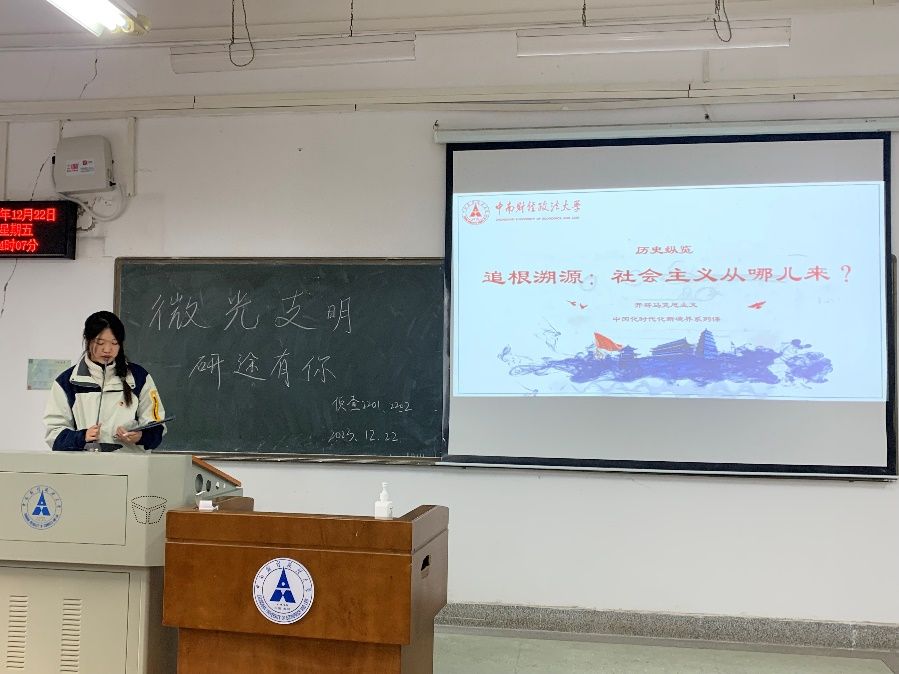 活动第一项,由三位主讲人向同学们讲授马克思主义中国化时代化的内涵。首先,吴涵轶同学向大家讲述马克思主义中国化时代化进程的历史必然性。追根溯源,讲授了中国共产党在百年来的探索与实践;以史为鉴,讲授了需明确坚持发展马克思主义的重要性;开拓创新,讲授了我们应守正创新,将马克思主义基本原理同中国具体实际、中华优秀传统文化相结合,不断攀峰。