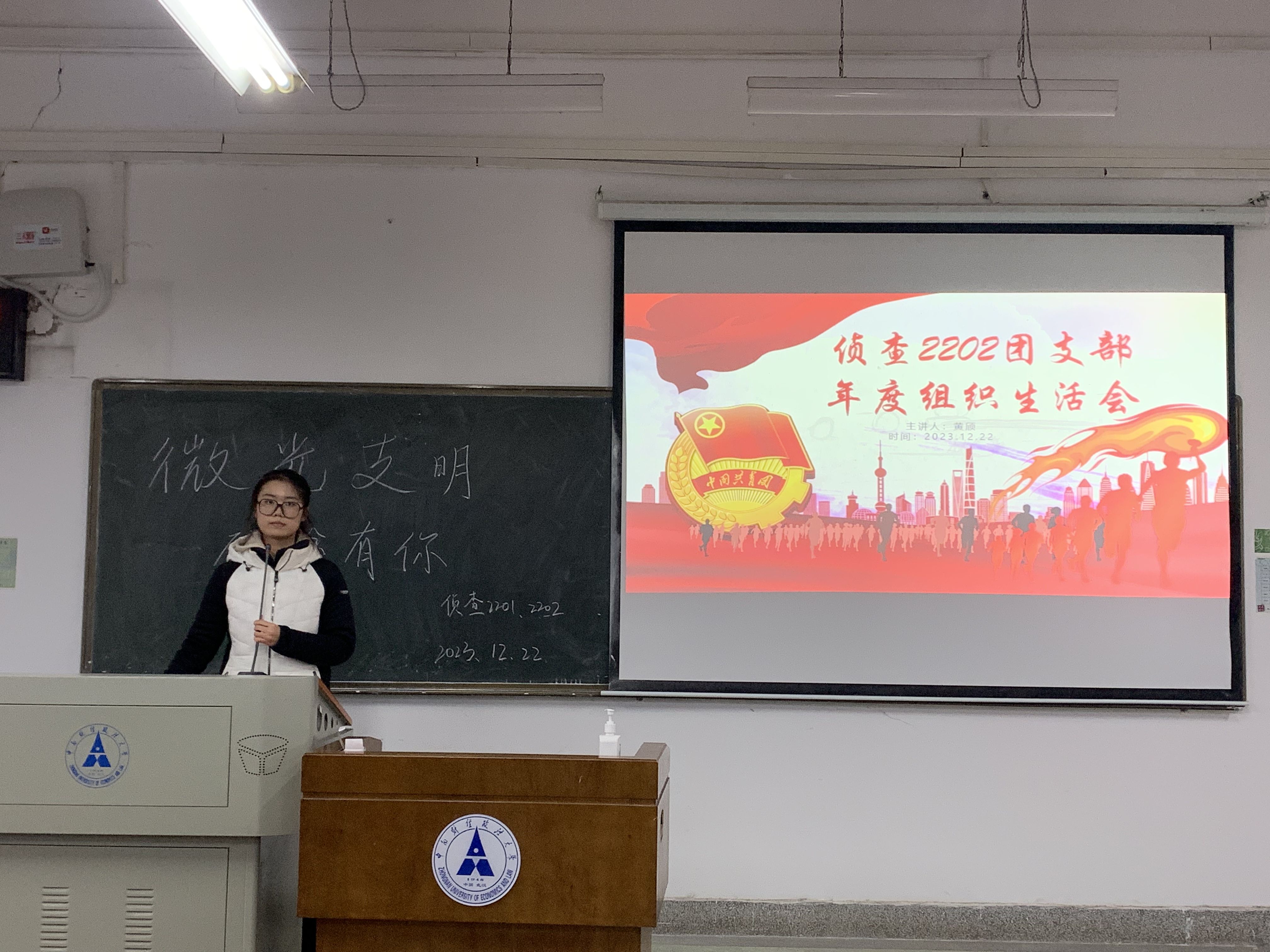 活动第三项,侦查2202团支部开展了本年度组织生活会,侦查2202团支部团支书黄颀同学向全体团员总结了本学期的团日活动参与情况,对支部成员积极参与志愿服务活动和理论学习的精神表示肯定,也指出部分团员需要提高青年大学习的参与积极性;介绍了下学期的工作计划和重点活动,同时听取团员的意见和建议。最后,侦查2202团支书黄颀同学与三位主讲人为同学们做期末考试的动员和祝福,同时发放给同学们活动卡片,书写下对即将到来的期末考试的寄语。