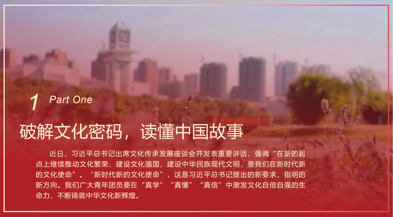 破解文化密码,读懂中国故事。侯昊坤首先带领大家深刻领悟了习近平总书记在向世界中国学大会·上海论坛致贺信中所提到的“中国学”,接着从“真学下足功夫,让文化自信‘活起来’”“真懂上下细功夫,让文化自信‘火起来’”“真信上下实功夫,让文化自信‘传起来’”三个方面加以详细介绍并播放视频资料让大家切实感受到中华文化的独特魅力。