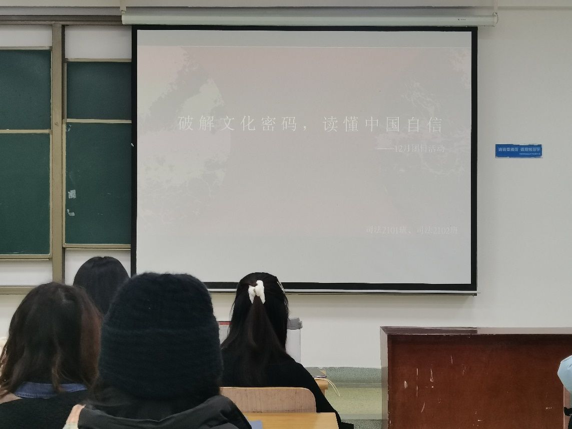 新闻网讯(学生通讯员 胡蝶)为提高青年文化自信,学习习近平总书记向世界中国学大会?上海论坛致贺信。12月18日,司法2101、2102团支部联合开展“破解文化密码,读懂中国自信”主题团日活动,激励同学们融会贯通中外优秀文化,推动文明交流互鉴。