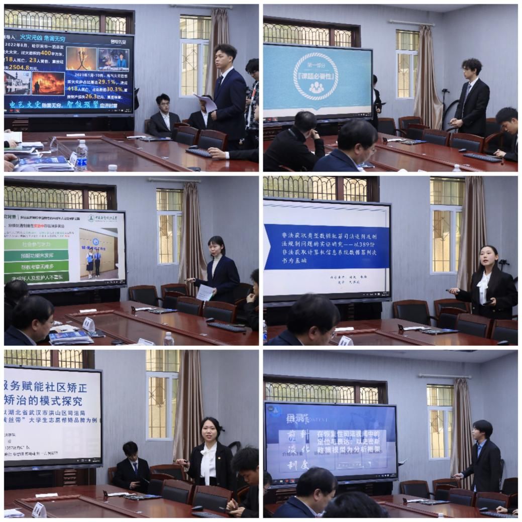 之后,创新类赛道各队伍依次上台展示了“志愿服务赋能社区矫正精准矫治的模式探究——以湖北省武汉市洪山区司法局‘飘动的黄丝带’大学生志愿帮矫品牌为例”、“智慧未检背景下罪错未成年人分级处遇制度研究——基于Bert模型动态评估”等5项研究成果。各团队围绕着争议焦点,就选题背景、调研意义、研究方案、研究成果、研究结论等方面进行了详细讲述,用专业的法律知识和数据模型分析实际问题,充分阐述了自己的观点,展示了出色的法律素养和辩论能力。