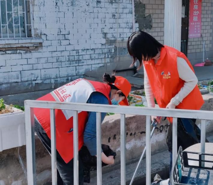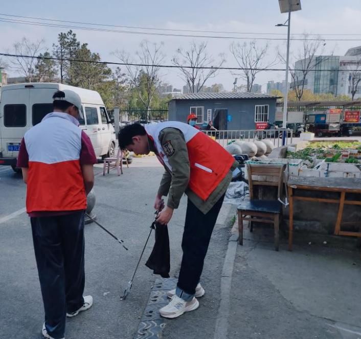 在活动中,团支部成员们手持环卫夹和垃圾袋,沿着街道两侧仔细清扫,不放过任何一个卫生死角,认真对待每一个清扫环节。与此同时,另一小队支部成员则使用铲刀等工具,对小区内的立柱、立牌、墙面上的“牛皮癣”广告进行深度清理。