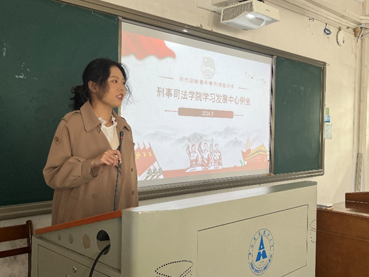 随后,刑事司法学院学习发展中心功能性团支部书记、学习发展中心顾问吴开创同学主持本次团日活动,就“深入学习贯彻习近平新时代中国特色社会主义思想——新质生产力的内涵特征和发展重点”这一主题,分为深刻认识新质生产力的基本内涵、深刻把握新质生产力的主要特征以及着力为发展新质生产力蓄势赋能三个部分进行讲解,在座同学认真聆听,收获颇多。
