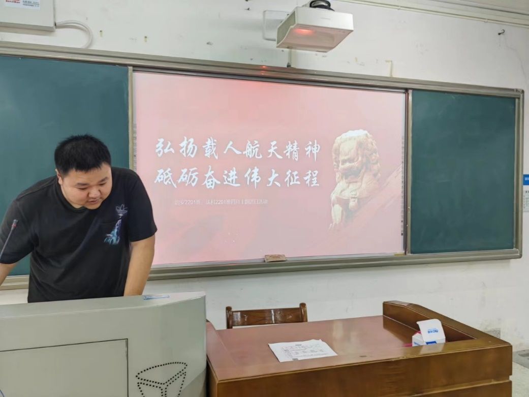 活动开始,由法科2201团支书熊博对本次团日活动的内容和环节作简要介绍。本次团日活动以中国航空航天近期取得的相关成就为切入点,通过播放视频的方式向同学们展现了历代航天人为国家深空探索事业所做出的伟大贡献,使同学们更加深刻地体会到如今的国泰民安、国家强盛的珍贵。