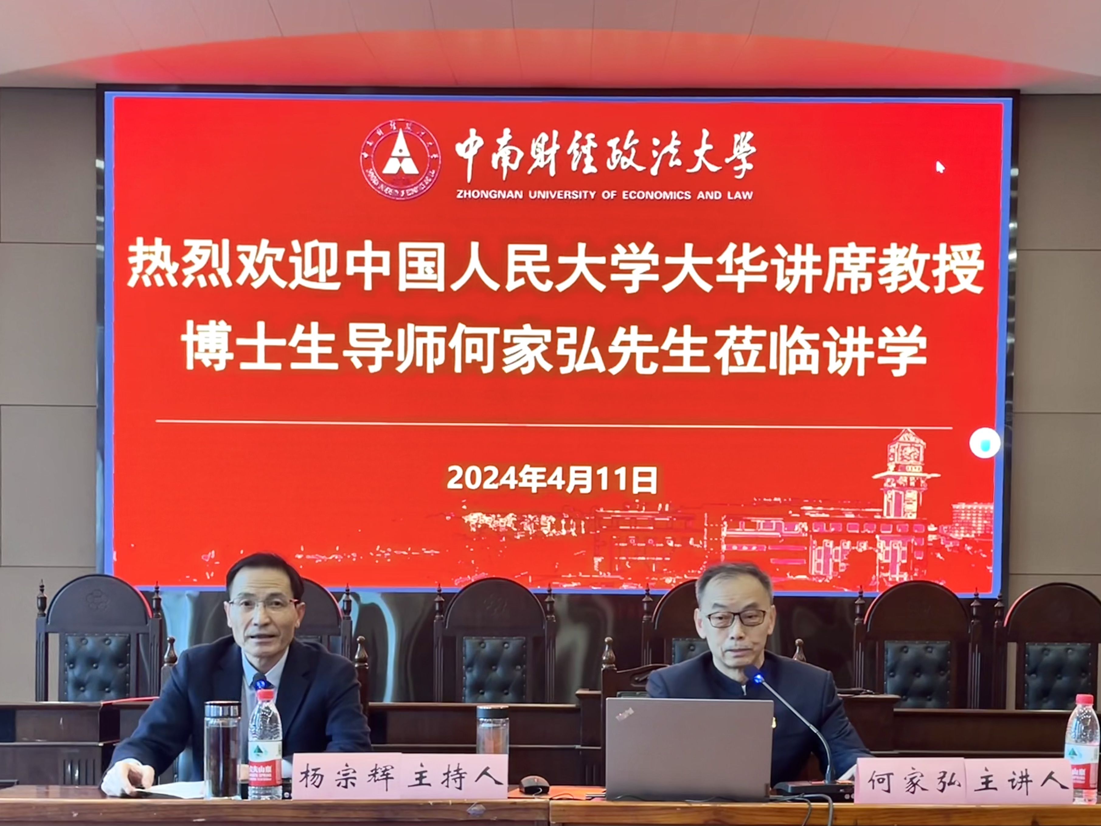 (学生通讯员 张思晗)2024年4月11日,何家弘教授应邀在中南财经政法大学文泰楼模拟法庭开展题为“刑事司法第一课”的学术讲座,刑事司法学院博士生导师杨宗辉教授担任讲座主持人。在讲座开始前,杨宗辉教授介绍了何家弘教授的基本情况。何家弘教授是中国人民大学大华讲席教授、法学院证据学研究所所长、反腐败与法治研究中心主任;兼任最高人民检察院的专家咨询委员、北京侦探推理文艺协会的会长、国际足联的道德委员会委员。他是中国第一个在美国获得法学博士学位的大陆学者,中国第一个犯罪侦查学方向的博士生导师,中国第一个享誉海外的侦探小说作家。