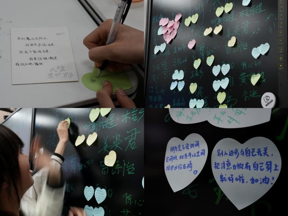 在各位“法师”们互相扶持、互相帮助下,大家终于通过了重重考核,适应了“魔法学院”的环境,成为了一名优秀的“法师”。而此时一道光闪过,“法师”们又回到了人类的世界。再次回到文波109教室时,写着难过、迷茫、焦虑的卡片已经消失,只剩下一张张充满祝福的卡片,上面温暖的话语深深触动着每一位同学的心灵。