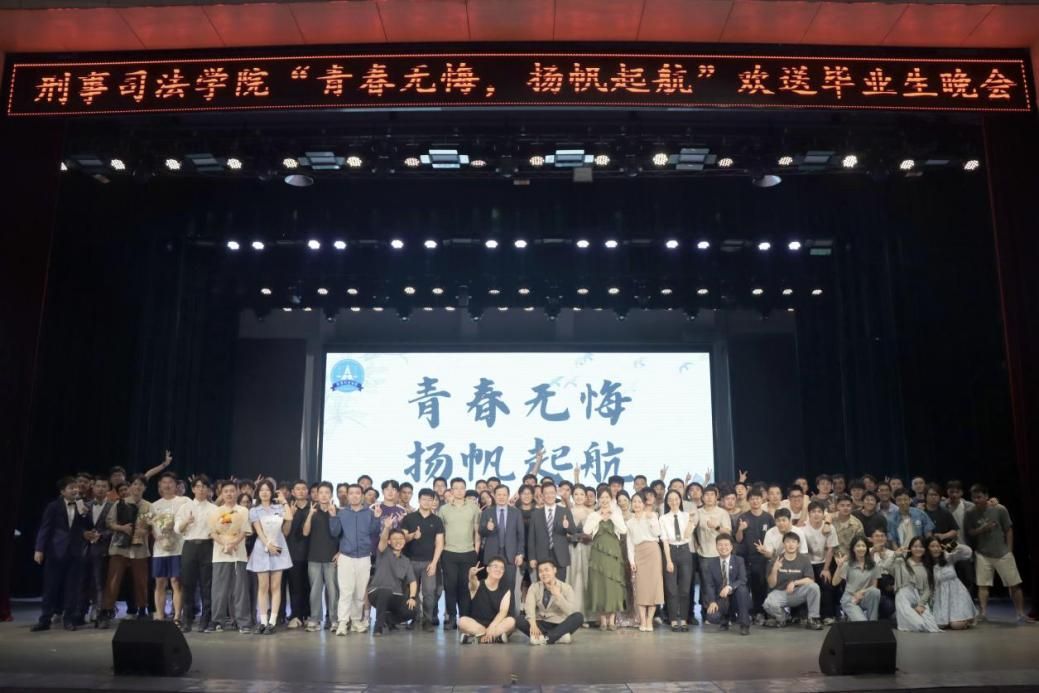 新闻网讯(学生记者 潘煜东 陈可璇)悠悠晓南湖,巍巍中南大,四年时光如白驹过隙,春风捎来毕业的讯息,写下离别思情。5月8日晚,刑事司法学院“青春无悔,扬帆启航”之第十三届“‘刑’影不离”欢送毕业生晚会在南湖会堂举行。刑事司法学院院长胡向阳、院党委书记张志刚、副院长周凌、刑法学系姚培培、警事科学系张丽霞、党政办主任刘宇、本科生辅导员陆薇、研究生辅导员王晓丹、柯希鹏出席晚会。