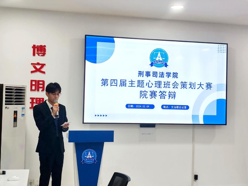 新闻网讯(学生记者 沈子翔)为贯彻落实习近平总书记关于学生心理健康工作重要指示精神,大力培育学生珍视生命、热爱生活的积极心理品质,5月9日,刑事司法学院第四届主题心理班会策划大赛院赛答辩在文治楼会议室顺利举行。此次答辩会邀请了第六届“全国百佳心理委员”喻宇轩、第26届研究生支教团成员吴涵轶和马闻泽担任答辩评审,院心理工作站活动部负责人胡括州主持答辩。